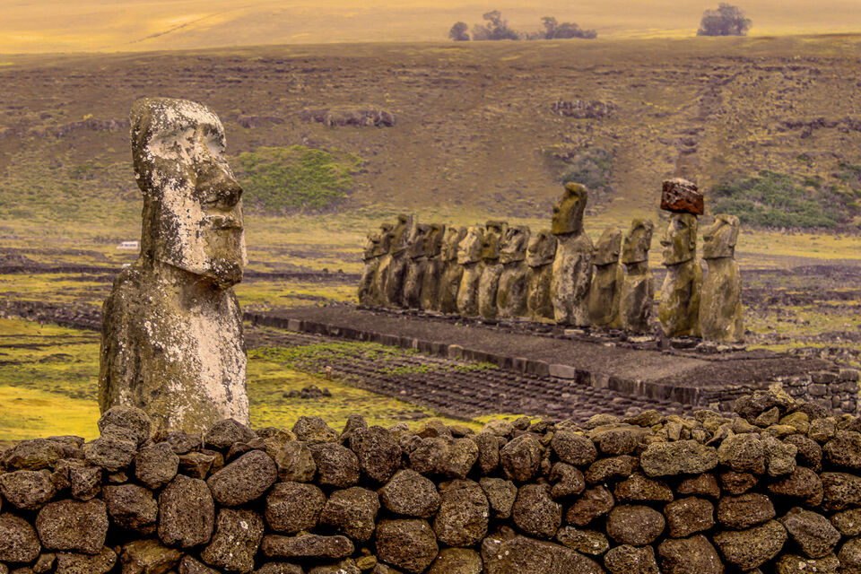 Uno de los moai más icónicos es el Hinariru, de cuatro metros de altura, conocido, por su forma, como el ‘moai del cuello torcido’. Hay moais con la cabeza tumbada hacia adelante y otros hacia atrás. La explicación es que al deslizarse no encajaron bien en la zanja. Otro moai célebre es el Piropiro, de cuatro metros de alto de cabeza y otros siete sepultados. El Ko Kona He Roa es un moai que lleva toscamente labrado en su tronco un barco con tres mástiles, que revela que hubo contacto con veleros europeos en la época en la que aún esculpían moais.
